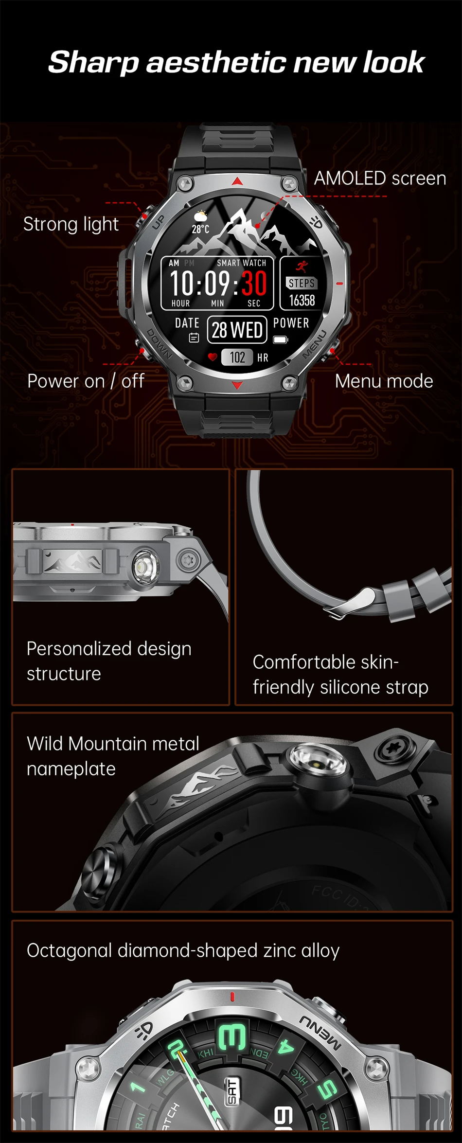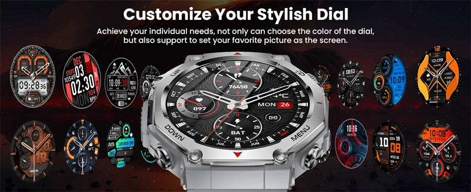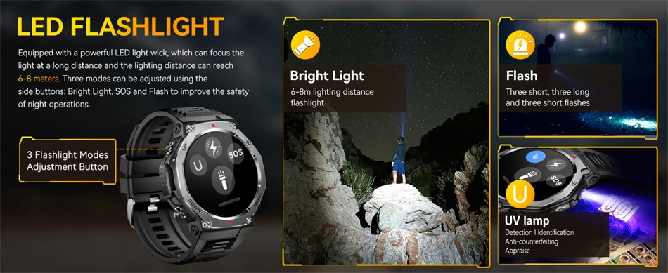 Dear customers, thank you very much for your support. This smartwatch has many very practical features! For example, with the flashlight function, you can use your watch as an emergency light in the dark; UV light: it can help you identify the authenticity of your currency and documents! Bluetooth call function, after connecting to the Bluetooth phone, you can answer or make calls through your watch! AI voice assistant function, control the watch through voice commands! The Sports Mode function can monitor your exercise time, distance, steps, calorie consumption, heart rate changes, and more. There is also a health monitoring function, which can monitor sleep, blood oxygen, and heart rate, and always pay attention to your health status! In addition, the watch supports a 50-meter waterproof depth, which can be easily dealt with whether it is swimming or diving. There will be a more detailed description next, please continue to read: