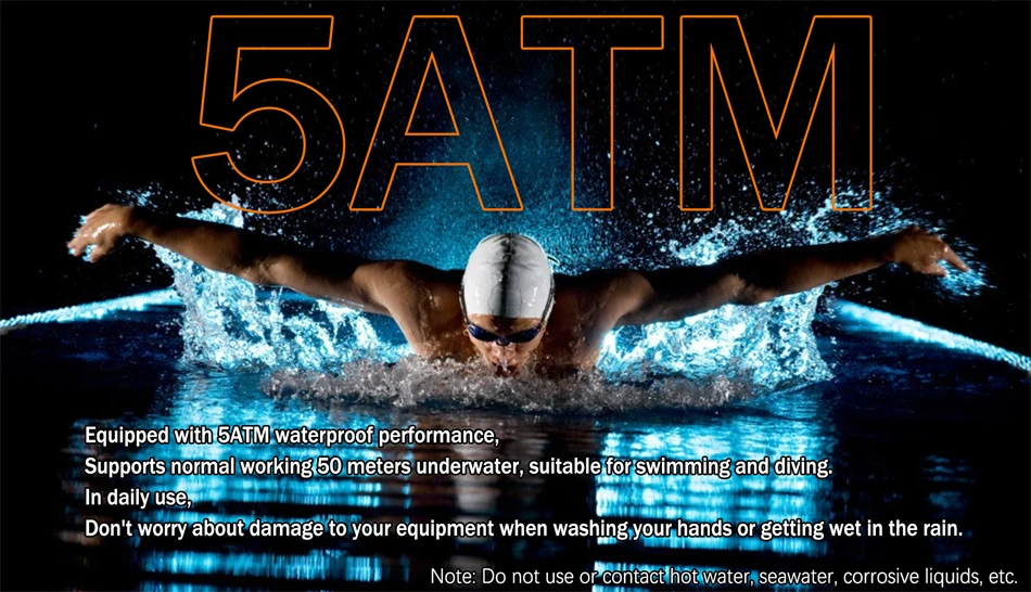 50 meters waterproof depth: The watch can withstand the pressure of 50m underwater depth and can be worn when swimming or diving. It does not need to remove it when it rains or when washing hands in daily life. (Note: Do not contact hot water, sea water or corrosive liquids)