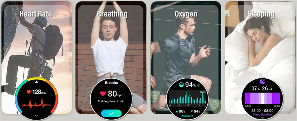 Health management functions: sleep monitoring, heart rate monitoring, blood oxygen monitoring, breathing training